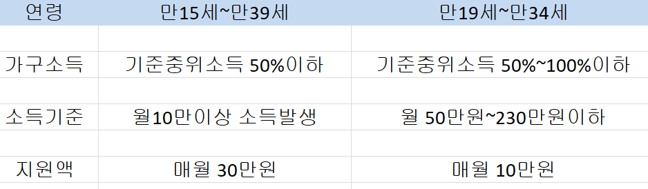 연령, 소득, 가구소득 3가지를 모두 충족하는 청년에게 지원합니다.